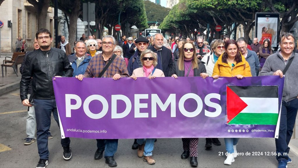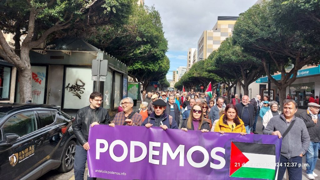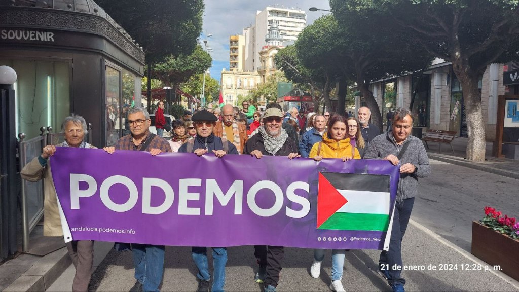 Podemos ha portado pancarta propia en la manifestación que salía, pasadas las doce, desde Puerta Purchena y finalizaba en la Plaza de las Velas donde, tras una representación donde se simulaba un bombardeo y las victimas que dejaba el mismo, se dio lectura del manifiesto en castellano y árabe como viene siendo habitual en las manifestaciones convocadas contra el genocidio en Palestina.